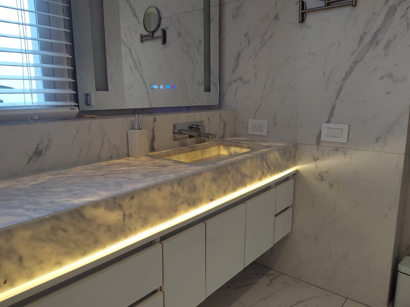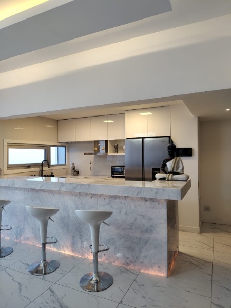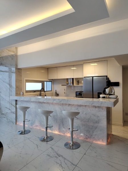 🧑🍳 Cocina semi integrada al frente con barra desayunadora con Mármol Turco Retro Iluminado. Y bacha inteligente con botonera digital y lavados independientes con cascada.