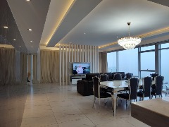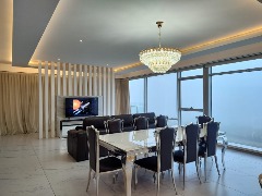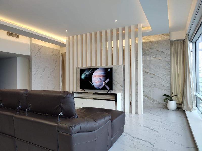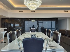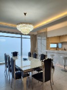 🛋 Gran living comedor, al frente con balcón saliente al Golf y al mar. Todo con porcelanato mate spl con textura de mármol calacatta. Juego de mesa spl y acero inoxidable. Sillón con posturas automáticas.